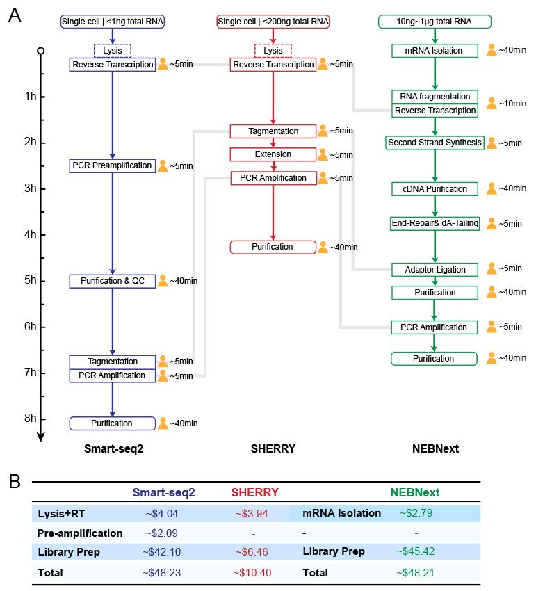 1月27日,PNAS上发表了一篇名为“RNA sequencing by direct tagmentation of RNA/DNA hybrids”的研究论文,该论文由北京大学的黄岩谊课题组、谢晓亮课题组与清华大学王建斌课题组合作完成。文章中开发了一种新的基于Tn5转座酶的转录组测序快速建库方法,并命名为SHERRY(Sequencing HEteRo RNA-DNA-hYbrid )。该方法与目前常用的转录组测序建库方法相比,大大简化了建库的过程;更值得关注的是该方法适用于微量样本及单细胞样本,对目前正肆虐的新型冠状病毒等样本的测序质量和速度也有望显著提升。