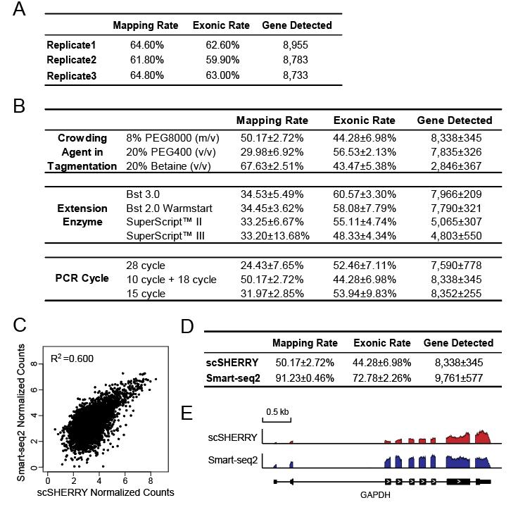 该论文研究发现,Tn5转座酶也能以类似方式直接识别RNA/DNA杂交链并对其进行切割与连接。SHERRY转录组测序建库流程如图2所示,分离提取的总RNA或单细胞裂解物经过oligo-dT引物反转录后,合成的RNA/DNA杂交链用Tn5转座酶复合体进行打断,并在杂交链两端加上通用的接头序列,再进行文库PCR。整个建库流程非常的简洁明快,仅5个步骤,与传统RNA建库技术相比,绕开了cDNA二链合成、末端修复加A、接头连接等繁琐的操作及纯化步骤。