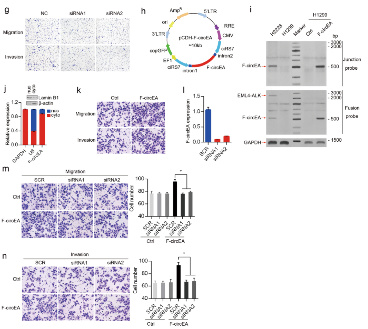 作者针对EML4-ALK融合基因的融合位点前后分别设计多种引物组合,然后选择EML4-ALK阳性的细胞株H2228和阴性细胞H1299 在RNase R消化条件下鉴定产物,并进一步测序验证,最终确证了F-circEA的存在。还通过Northern杂交验证了内源性F-circEA的真实性。与此同时,作者还分析了F-circEA的亚细胞定位,表明它主要定位于细胞质中。