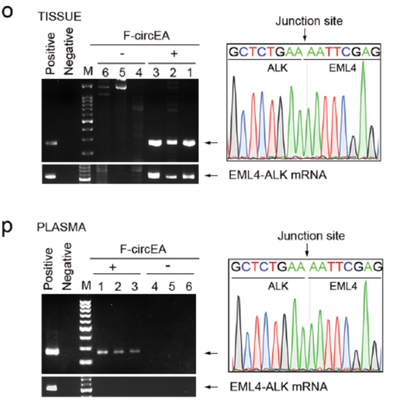 F-circEA具有促进癌细胞迁移能力的作用,那么在临床标本中的表达情况怎样呢?作者挑选了EML4-ALK阳性的患者标本,分别分析肿瘤组织和血液中F-circEA的表达情况,结果表明F-circEA可以同时存在于血浆和肿瘤组织中,而融合基因EML4-ALK的mRNA则只存在于肿瘤组织中,没有在血浆中检测到。