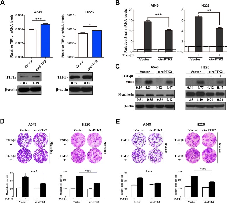 为了验证circPTK2在体外的作用,作者设计了与circPTK2特异结合的siRNA,以抑制circPTK2的功能,转染该siRNA有效抑制了A549和H226细胞中的circPTK2水平(图A),但对线性PTK2 mRNA水平无影响(图B)。下调circPTK2表达显著抑制TIF1γ表达 (图C)。对circPTK2表达被抑制的 A549和H226细胞注射TGF-β1,会促进该细胞表达Snail和N-cadherin (图D)。此外, 下调circPTK2表达显著增强TGF-β诱导EMT 和肺癌细胞转移的能力(图EF)。总的来说,这些结果表明沉默circPTK2可以抑制TIF1γ表达,进而促进TGF-β诱导 EMT和非小细胞肺癌细胞转移。