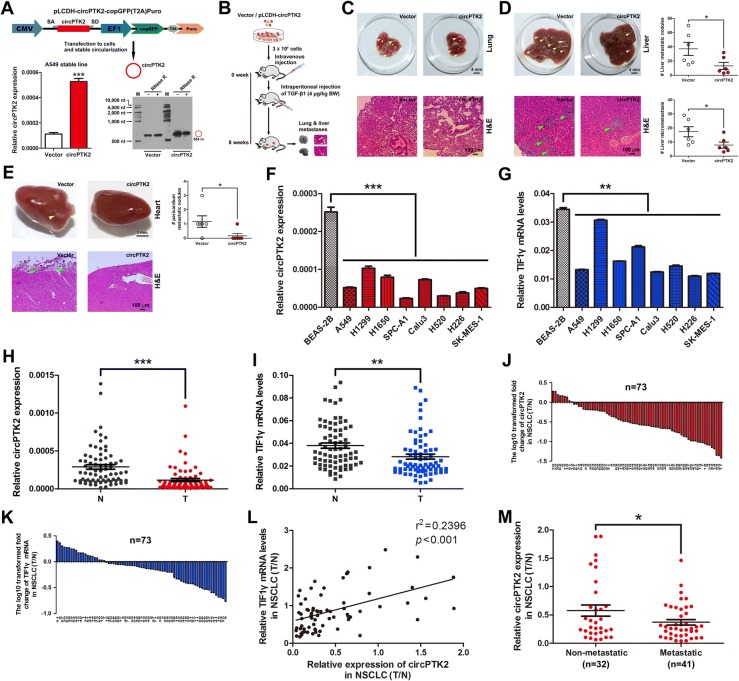 作者基于pLCDH-ciR (吉赛生物)载体建立了过表达circPTK2的A549稳定细胞系 (图A)。然后, 将过表达circPTK2的细胞与空白对照分别通过尾静脉注射到BALB/c裸小鼠体内,接着接种TGF-1 (图B)。接种8周后,实验表明注射了含过表达circPTK2载体的细胞有效地抑制了肺癌转移(图C-G)。总的来说,体内转移实验表明过表达circPTK2抑制了体内NSCLC细胞的转移。