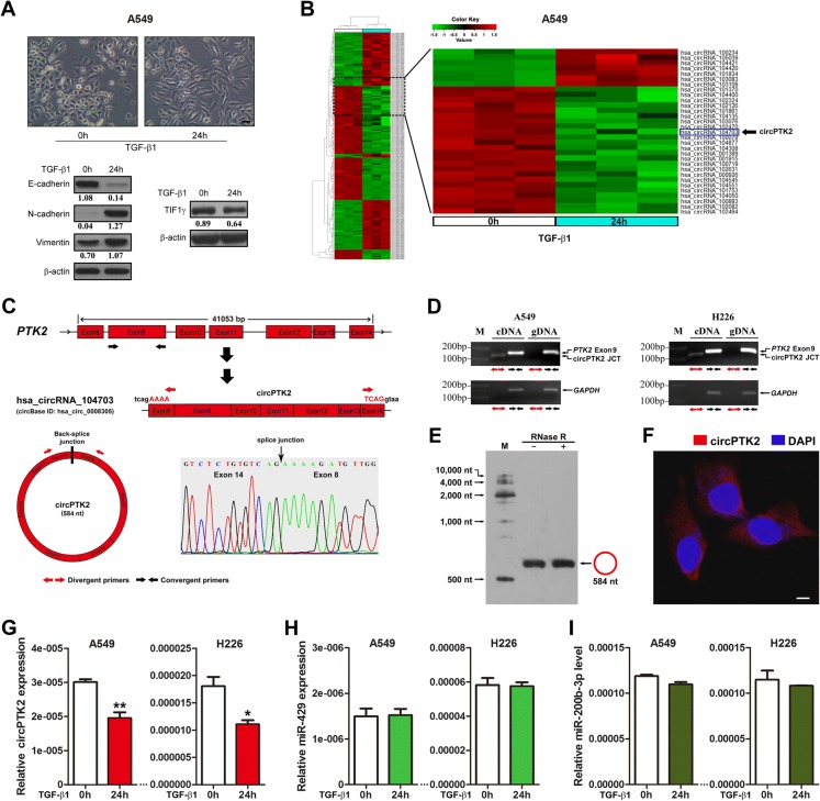 首先,作者先用TGF-β1(5 ng / ml)处理A549细胞24小时后,A549细胞发生上皮细胞间充质转化(EMT)(图A)。对A549细胞的RNA进行表达谱分析,研究发现88种circRNAs上调和99种circRNAs被抑制 (图B)。基于TargetScan/miRBase 和miRanda计算法分析,作者预测circPTK2(ID:hsa_circRNA_104703)和TIF1γ3 ‘ UTR区都有mir – 429 / mir – 200 b – 3 – p 的结合位点(图C)。因此,作者选取了circPTK2(hsa_circRNA_104703),并用 RT-PCR,sanger测序,northblot和免疫荧光实验鉴定circPTK2特异性存在,并主要分布在细胞质中(图CDEF)。