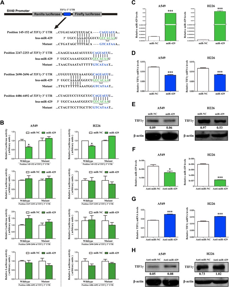 作者克隆了 TIF1γ3’UTR区域,发现其包含mir – 429 / mir – 200 b – 3 p结合位点(图A),通过荧光素酶实验报告表明,TIF1γ3 ‘ utr 区存在与mir – 429和 mir – 200 b – 3 – p结合的序列。此外,瞬时过表达的miR-429/miR-200b-3p(图C)显著抑制A549和H226 细胞中TIF1γ的表达 (图DE)。相比之下,瞬时过表达miR-429/miR-200b-3p的抑制剂(图F)则增强A549和H226细胞中TIF1γ的表达(图GH)。