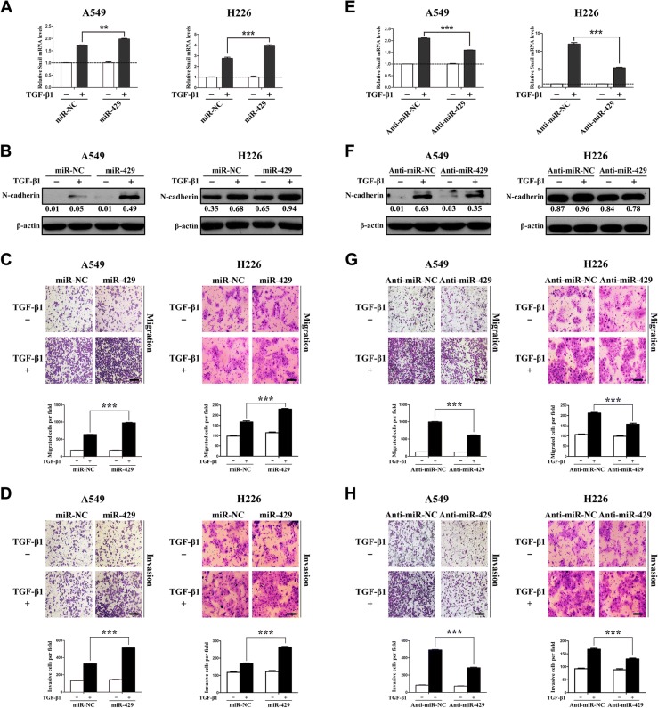 TGF-β1刺激细胞A549和H226 过表达 mir – 429 / mir – 200 b – 3 – p,导致Snail的mRNA的转录与N-cadherin的表达均增加 (图A B)。此外,mir – 429 / mir – 200 B – 3 – p增强了TGF-β诱导EMT和促进肺癌细胞迁移的能力(图CD),过表达miR-429/miR-200b-3p抑制剂结果则相反(图EFGH)。