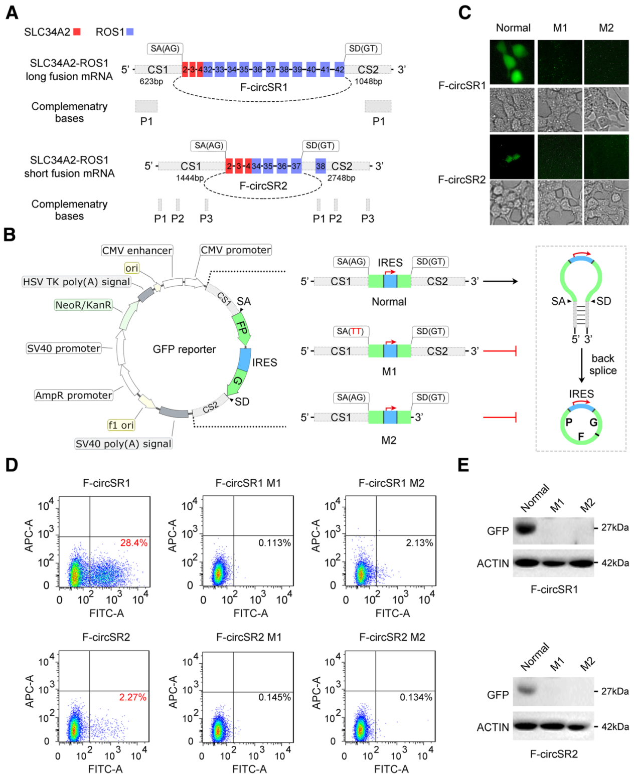 反向拼接位点两侧的侧翼内含子需要对circRNA的形成至关重要,作者接下来探索了两种SLC34A2-ROS1融合基因circRNA对应的侧翼内含子序列在对应circRNA形成过程中的作用。序列分析表明F-circSR1的侧翼内含子序列互补效率明显高于F-circSR2的侧翼内含子,将对应的互补序列构建GFP报告基因结果也表明F-circSR1的侧翼序列能更有效的促进成环(该报告系统是将GFP基因拆分为两段,上下游互换位置,如果对应的序列能够准确环化,则可表达正确的GFP蛋白,否则不能表达完整的GFP蛋白)。