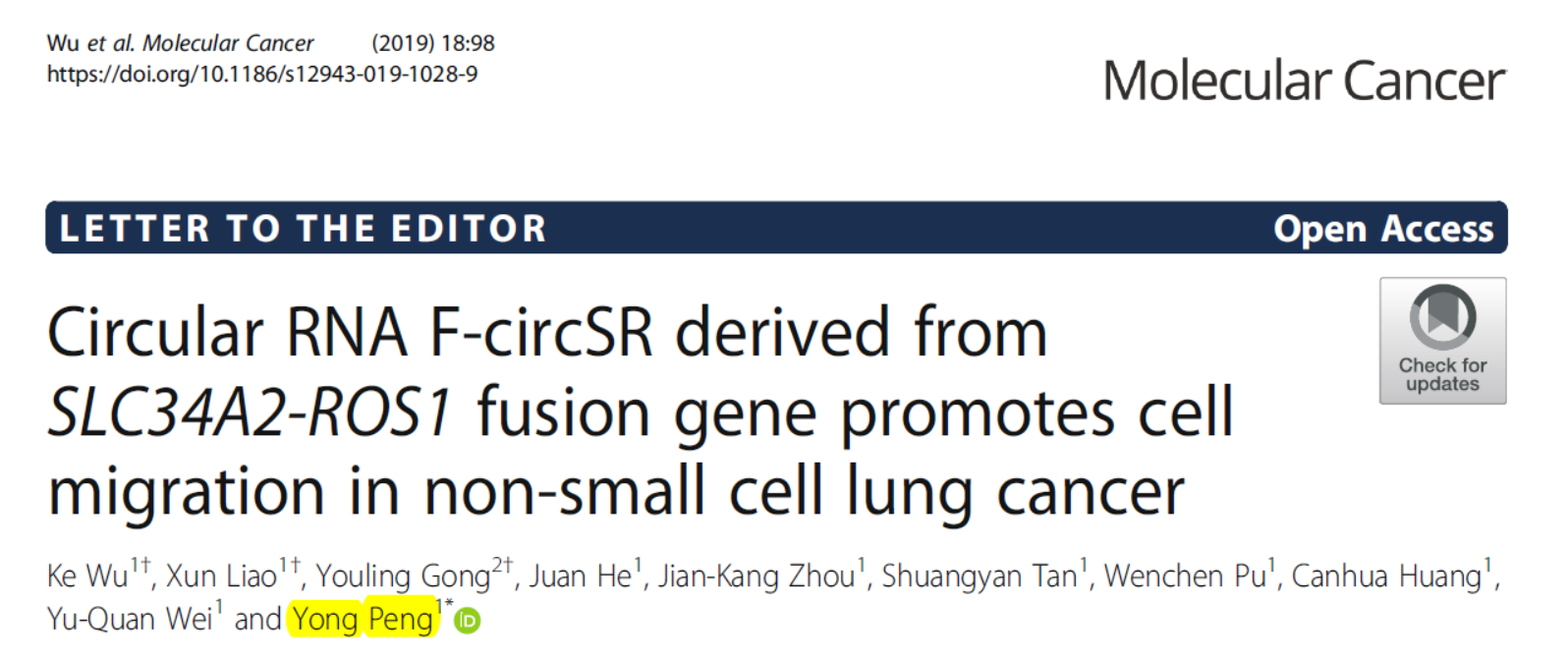 彭勇教授之前也曾发表过肺癌中融合基因来源的circRNA功能研究的文章,下面我们一起学习一下本文: