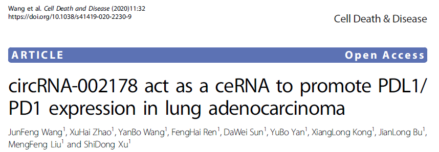 PD-L1 /PD-1靶向治疗通过阻断PD-L1 /PD-1信号通路使肿瘤细胞死亡,具有治疗多种类型肿瘤的潜力。在2020年1月16日,哈尔滨医科大学徐世东教授团队在Cell Death & Disease 发表了一项肺腺癌中circRNA的研究工作。报道发现circRNA-002178可能通过ceRNA机制,促进肿瘤细胞中PDL1表达;同时肿瘤细胞中circRNA-002178由外泌体递送到CD8+ T细胞中,通过促进PD1 表达实现肿瘤细胞的免疫逃避。
