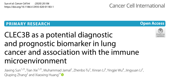 Sun J, Xie T, Jamal M, et al. CLEC3B as a potential diagnostic and prognostic biomarker in lung cancer and association with the immune microenvironment[J]. Cancer cell international, 2020, 20(1): 1-15.