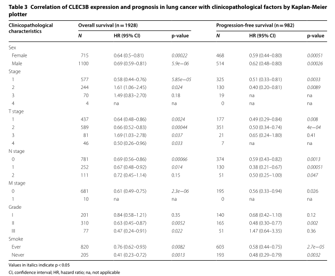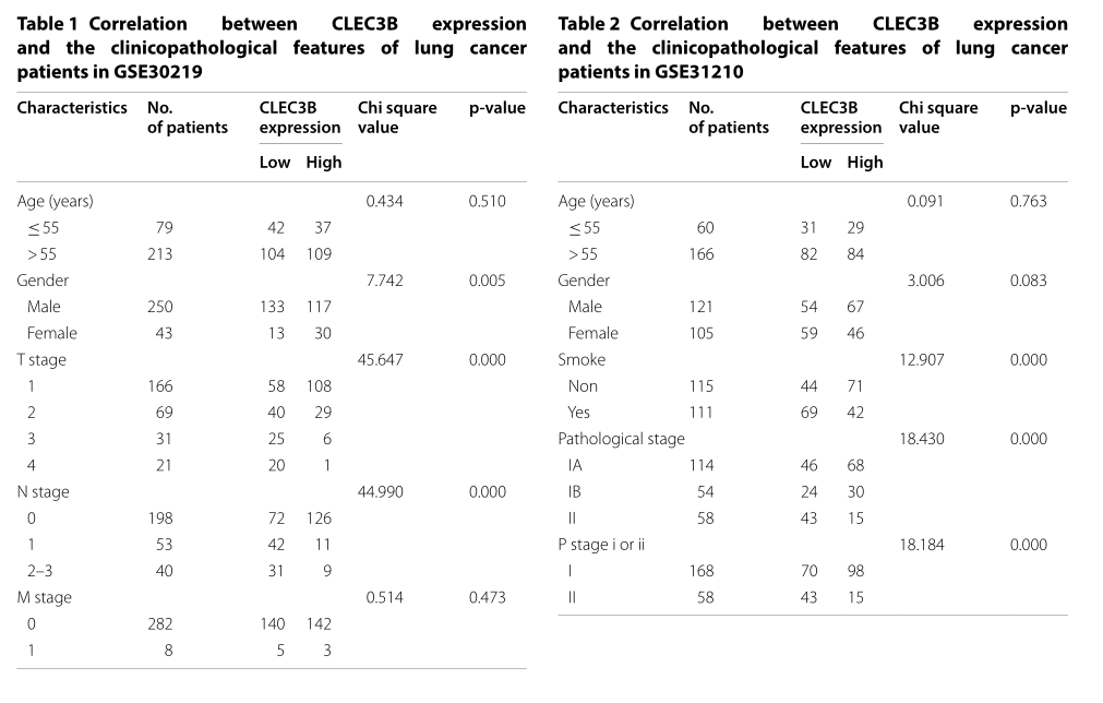 为了确定CLEC3B表达与临床病理特征之间的相关性,我们分析GSE30219和GSE31210数据集,发现CLEC3B下调与T期(p <0.001),N期(p(<0.001),病理期(p <0.001)和吸烟(p(<0.001)(表1、2)密切相关。