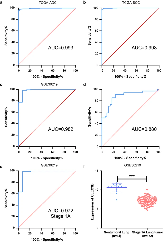 Fig3:CLEC3B在肺癌中的诊断价值。a,b TCGA数据集中ADC患者和SCC患者的ROC曲线。c GSE30219中所有肺癌患者的ROC曲线。d组织芯片LAC-1403肺癌患者的ROC曲线。GSE30219中1A期肺癌患者的e ROC曲线。f CLEC3B在GSE30219中的正常肺癌和1A期肺癌中的表达。ROC曲线,受试者工作特性曲线;AUC,受试者工作特性曲线下的面积;ADC,腺癌;SCC,鳞状细胞癌。*** p <0.001