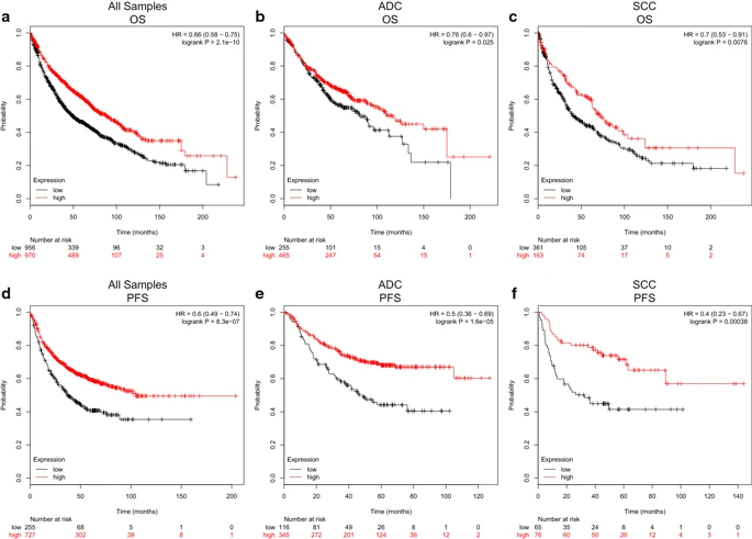 Fig4:Kaplan–Meier生存曲线比较CLEC3B高表达和低表达的肺癌患者。a所有肺癌患者(n = 1926),b ADC患者(n = 720)和c SCC患者(n = 524)的OS生存曲线。所有肺癌患者(n = 982),ADC患者(n = 461)和SCC患者(n = 141)的d–f PFS生存曲线。OS,整体生存率;PFS,无进展生存期;人力资源,危险比;CI,置信区间;ADC,腺癌;SCC,鳞状细胞癌