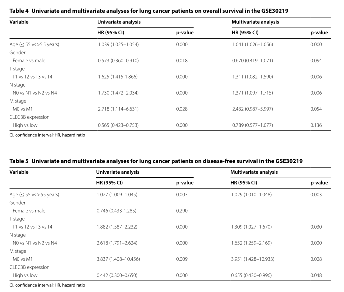为了更好地了解CLEC3B低表达对生存的影响,Kaplan–Meier数据库分析CLEC3B表达与患者临床特征之间的相关性。CLEC3B的下调与1至2期,T1至T2期和N0至N1期肺癌患者的OS和PFS恶化相关(p <0.05)。此外,CLEC3B的低表达预测吸烟和不吸烟患者的OS和PFS均较差(p <0.05)(表3)。进行Cox回归模型以进一步评估CLEC3B表达的预后潜力。在单变量分析中,CLEC3B表达(HR = 0.565,95%CI 0.423-0.753,Cox p = 0.000)是OS的重要预测指标(表4)。无病生存期(DFS)的多元分析值显著(HR = 0.655,95%CI 0.430-0.996,Cox p = 0.048),而OS则无(表5)。因此,CLEC3B的较低表达可能被定义为肺癌患者DFS的独立危险因素。此外,还可以在GSE30219(其他文件6:图S2a,b)和GSE30210数据集(其他文件6:图S2c,d)中验证能够预测较差OS和DFS的CLEC3B的低表达。