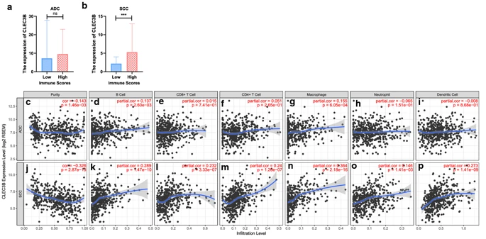Fig5:ADC和SCC中CLEC3B表达与免疫浸润水平的相关性。a,b ADC和SCC高免疫评分组和低免疫评分组之间CLEC3B表达的比较。c–p CLEC3B与TIMER分析的肿瘤纯度以及ADC和SCC的免疫浸润水平有关。ADC,腺癌;SCC,鳞状细胞癌;ns,没有意义。*** p <0.001