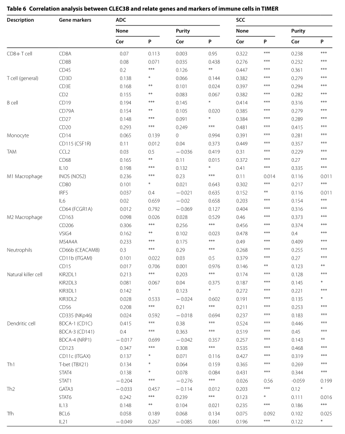 在TIMER数据库中分析了CLEC3B与免疫细胞免疫标志物之间的相关性,以探讨CLEC3B与ADC和SCC的免疫浸润细胞之间的关系(表6)。在SCC中,CLEC3B的表达与不同功能性T细胞(CD8 + T,Th1,Th2等),B细胞,树突状细胞,嗜中性粒细胞和自然杀伤细胞的大多数基因标记呈正相关。结果如图5所示。此外,CLEC3B与肿瘤相关的巨噬细胞(TAM)浸润有关,既发挥了抗肿瘤作用又发挥了促肿瘤作用。但是,CLEC3B的表达与ADC中B细胞,DC,嗜中性粒细胞,自然杀伤细胞和Th1细胞的标记物仅有极强的相关性。结果表明,CLEC3B的表达水平与SCC免疫细胞的大多数免疫标记显著相关,而ADC中仅有少数标记。这些发现可能为CLEC3B在ADC和SCC中的预后价值差异提供了解释。