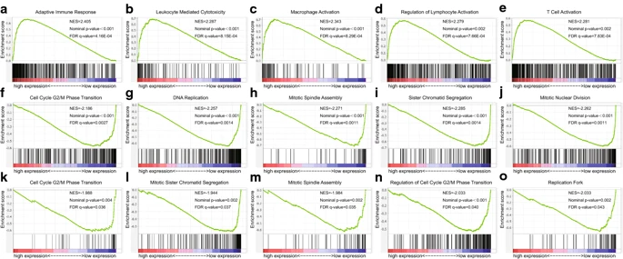 Fig6:根据CLEC3B在肺癌中的表达丰富了免疫激活和细胞周期过程。使用ADC和SCC的TCGA基因表达谱进行基因集富集分析,并选择“ c5.all.v5.1”基因集进行分析。a–e免疫激活过程在SCC的CLEC3B高表达组中富集。f–j细胞周期过程在ADC的CLEC3B低表达组中富集。k–o细胞周期过程在SCC的CLEC3B低表达组中富集。
