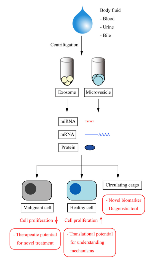 寻找肝脏疾病的新型分子标志物一直是研究热点,也是难点。不同肝脏疾病中,细胞分泌的外泌体所携带的核酸和蛋白组分之间存在差异。这些不同生理状态下外泌体所携带的特异性蛋白分子、miRNA等,是潜在的分子诊断和预后标志物。