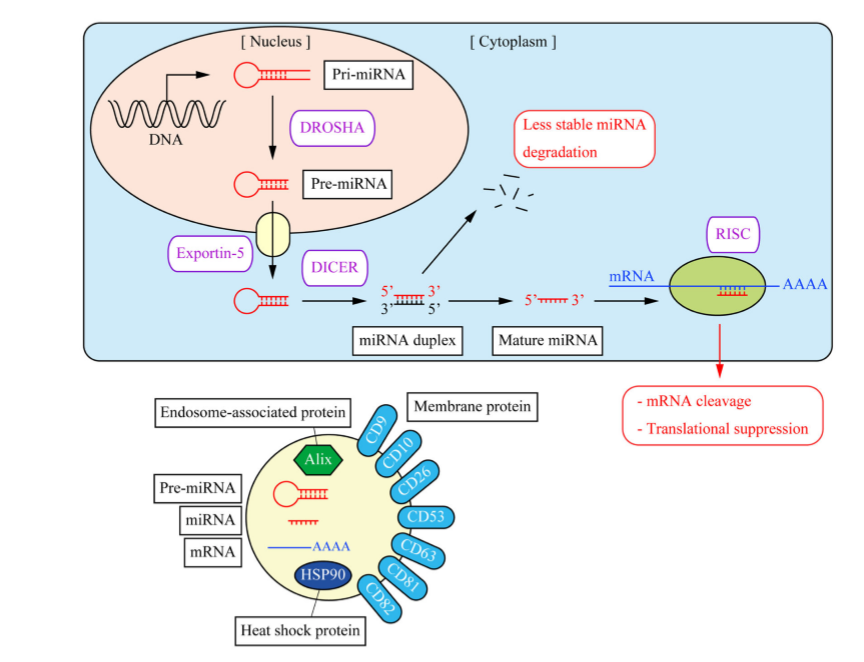 上:miRNA的形成机制:细胞核中,DNA转录形成初始转录本pri-miRNA,经RNaseIII酶DROSHA剪切生成前体pre-miRNA,在核转运蛋白Exportin-5作用下转运至细胞质中。细胞质中,pre-miRNAs被DICER剪接形成miRNA双链。其中一条链用于形成成熟的miRNA,另一条因稳定性差而被降解。成熟的miRNA与靶标mRNA的3’UTR结合形成RISC复合体,抑制mRNA的翻译或促进它的降解。(下)外泌体的内容物:典型的外泌体包含各种不同的组分,包括pre-miRNAs、miRNAs、mRNA和膜标志蛋白、MVB来源的蛋白和热休克蛋白(分子伴侣)。