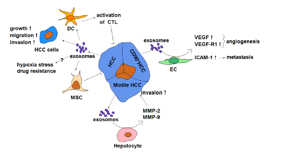 一方面,外泌体可以通过调控细胞的恶性转化如细胞增殖、迁移和侵袭,促进HCC的发生发展。另一方面,恶性肿瘤细胞分泌的外泌体可以协同其他肿瘤细胞一起,调控肿瘤微环境,以利于HCC发展。人HCC细胞外泌体中含有的一系列miRNAs,会减弱其他HCC细胞中TGF-β通路上的蛋白表达,促进HCC细胞的生长。HCC细胞外泌体还会诱导非致瘤性肝细胞发生细胞迁移和侵袭,具有运动能力的HCC通过释放外泌体诱导肝细胞分泌MMP-2和MMP-9,增强HCC细胞的侵袭能力。经HCC中分离到的CD90+外泌体处理的内皮细胞会表达更多的VEGF和VEGFR1,促进血管生成;同时诱导ICAM-1表达促进细胞转移。还有研究表明外泌体参与HCC缺氧胁迫和药物耐受的调控。