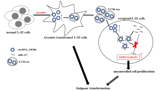 恶性细胞与旁边良性细胞之间的细胞间通讯参与了致癌过程。在致癌发生过程中,外泌体作为细胞间通讯的信使。circRNAs是一种功能性的非编码RNA,可以调节细胞周期和增殖。但是,外泌体中circRNAs功能还不清楚。这篇文章探讨了亚砷酸盐所致恶性转化的人肝上皮细胞(As-T-L-02)是否分泌circRNAs传递到正常的L-02细胞中,并诱导其恶性转变。