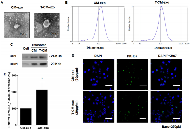 - As-T-L-02细胞分泌的外泌体被正常的L-02细胞摄取,导致其胞内circRNA_100284水平升高。提取到As-T-L-02细胞分泌的外泌体。进行TEM电镜(Fig. 3A)、NTA分析(Fig. 3B)、WB检测外泌体marker蛋白(Fig. 3C)和RT-PCR检测其包含的circRNA_100284水平(Fig. 3D)。最后通过confocal验证外泌体可以被正常L-02细胞摄取(Fig. 3E)。