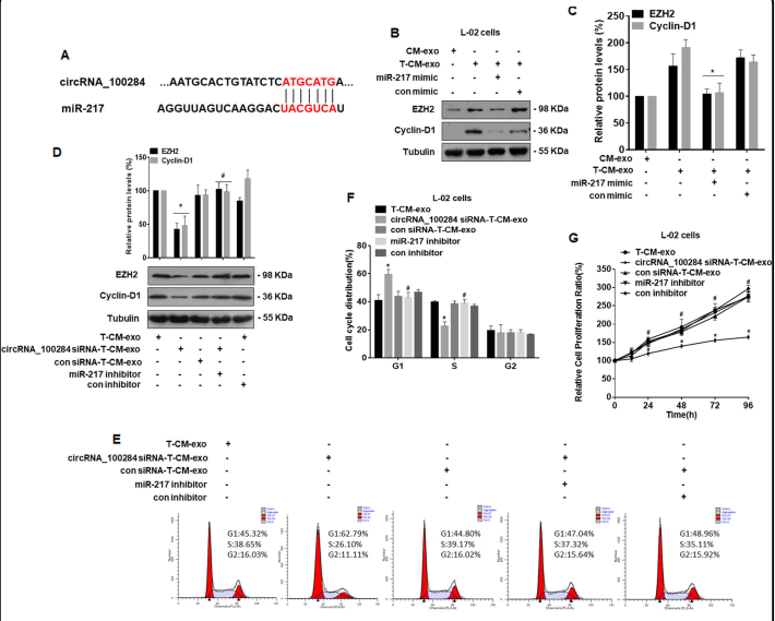- As-T-L-02细胞分泌的外泌体circRNA_100284通过竞争结合miR-217促进正常L-02的细胞周期和增殖。由于作者之前的研究[2]就已经发现circRNA_100284可以作为miR-217的海绵(sponges),调控基因的表达,作者猜想并验证这里的效应也涉及到该机制。首先在数据库通过生物信息学方法预测了两者的结合位点(Fig. 5A)。正常L-02细胞经转染miR-217 mimics后,再给予As-T-L-02细胞分泌的外泌体刺激,WB检测EZH2 和 cyclin-D1蛋白水平降低(Fig. 5B, C);正常L-02细胞经转染miR-217 抑制剂后,再给予经转染circRNA_100284 siRNA 的As-T-L-02细胞分泌的外泌体刺激,原本下调的EZH2 和 cyclin-D1蛋白水平恢复到正常水平(Fig. 5D),原本受到抑制的G1/S期转换恢复正常(Fig. 5E, F),原本降低的增殖能力也恢复正常(Fig. 5G)。