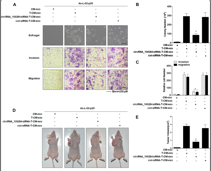 - As-T-L-02细胞分泌的外泌体circRNA_100284在促进正常L-02细胞发生恶性转化过程中发挥着重要作用。给予经转染circRNA_100284 siRNA的As-T-L-02细胞分泌的外泌体刺激后,锚着非依赖性实验检测As-L-02-p20细胞的细胞克隆团形成能力显著降低(Fig. 6A, upper, B),transwell实验检测L-02细胞的迁移和侵袭能力增强(Fig. 6A, lower, C),As-L-02-p20细胞体内成瘤能力显著降低(Fig. 6D, E)。