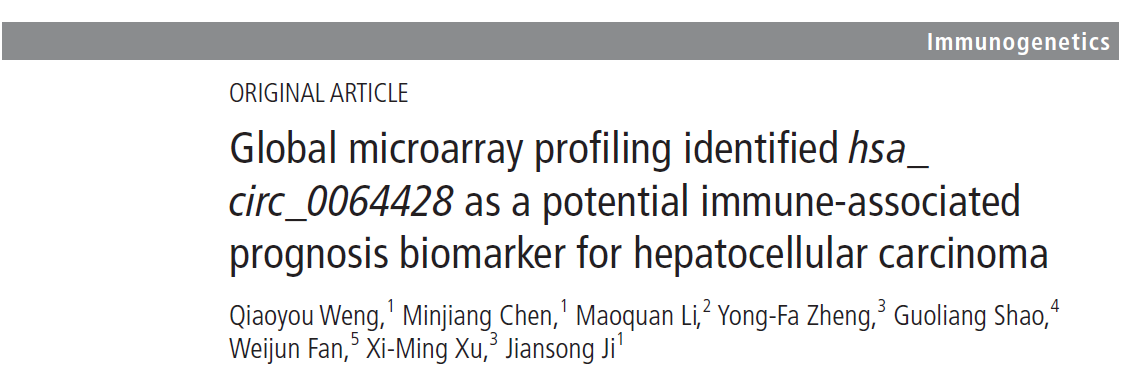 1. Weng Q, et al. Global microarray profiling identified hsa_circ_0064428 as a potential immune-associated prognosis biomarker for hepatocellular carcinoma. J Med Genet. 2018 Aug 17. pii: jmedgenet-2018-105440. doi: 10.1136/jmedgenet-2018-105440.