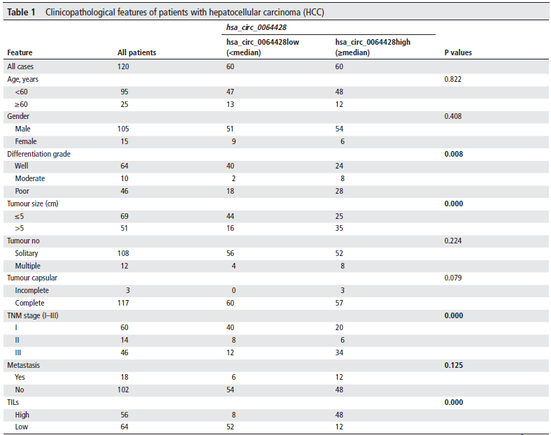 Kaplan-Meier生存曲线分析,发现只有hsa_circ_0064428的表达水平与HCC患者的OS成负相关,提示hsa_circ_0064428可作为HCC独立的预后生物标志物。为了进一步说明hsa_circ_0064428的临床预测功能,作者对具有高/低水平hsa_circ_0064428的临床病人分析其TILs的比例、肿瘤体积大小和HCC恶化发展情况,证明了具有高水平hsa_circ_0064428的HCC患者具有低比例的TILs、更大肿瘤体积和容易恶化转移的趋势。