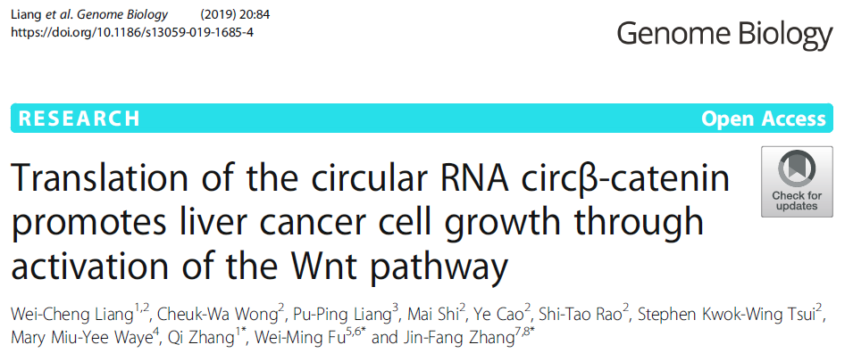 - Liang WC, Wong CW, Liang PP, et al. Translation of the circular RNA circβ-catenin promotes liver cancer cell growth through activation of the Wnt pathway. Genome Biol. 2019 Apr 26;20(1):84. doi: 10.1186/s13059-019-1685-4.