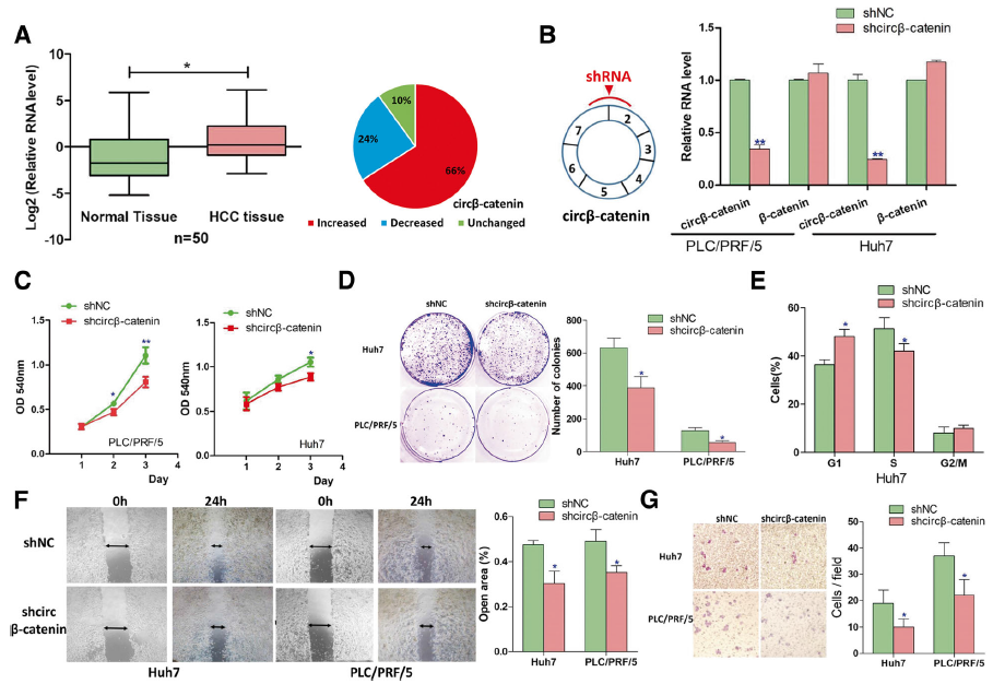 circβ-catenin的表达水平在肝癌组织和肝癌细胞系中明显上调,为进一步了解circβ-catenin在肝癌发生中发挥的作用,利用shRNA敲低circβ-catenin表达,在不影响正常β-catenin mRNA表达水平基础上,体外MTT实验、克隆形成实验、流式周期分析、迁移和侵袭实验证明,敲低circβ-catenin表达后细胞的增殖、迁移和侵袭能力明显降低,细胞阻滞在G1/S期。如果同时过表达circβ-catenin,则会rescue这些表型;但是过表达携带突变启动子的circβ-catenin载体,则无法rescue这些表型,说明能否rescue成功有可能取决于circβ-catenin编码蛋白的功能。