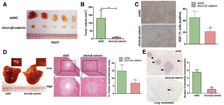 利用circβ-catenin稳定敲低的Huh7细胞株,建立在裸鼠皮下成瘤、在肝组织原位成瘤和在尾静脉注射后观察肺转移等模型,发现敲低circβ-catenin表达可以明显抑制肿瘤细胞在体内的生长和转移。