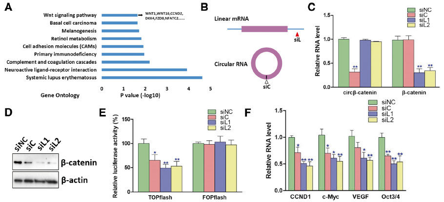 经生信分析和qRT-PCR验证,敲低circβ-catenin表达影响到的基因主要参与Wnt/β-catenin信号通路。敲低circβ-catenin表达可影响circβ-catenin表达和β-catenin蛋白水平,而不影响β-catenin mRNA水平,提示circβ-catenin可能调控β-catenin转录后翻译或者降解的过程。荧光素酶报告基因实验证明,与敲低β-catenin mRNA表达的结果一致,敲低circβ-catenin表达可以抑制β-catenin的结合作用。同时敲低β-catenin或者circβ-catenin表达均可抑制β-catenin靶基因的表达,提示circβ-catenin调控β-catenin表达,进而影响β-catenin靶基因的表达。