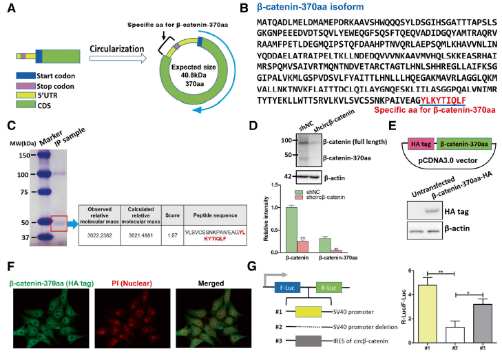 经生信预测分析,circβ-catenin含有一个内部核糖体进入位点IRES,有可能编码长度为370aa的新型β-catenin蛋白。β-catenin-370aa含有与正常β-catenin一样的N端氨基酸序列,但它的C端 含有9个特异的新氨基酸。利用识别N端序列的β-catenin抗体IP下来后进行质谱分析,证实了这种β-catenin-370aa蛋白的存在。免疫荧光实验证明β-catenin-370aa蛋白主要定位在胞浆。Dual-Luciferase报告系统证明,circβ-catenin中的推测IRES序列具有启动基因翻译的能力。