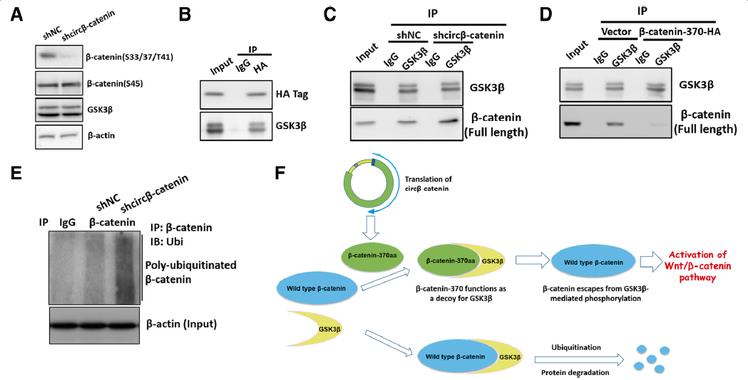 从前面的结果提示circβ-catenin可能调控β-catenin转录后翻译或者降解过程,β-catenin的稳定性与其磷酸化状态紧密相关。因为GSK3β磷酸化β-catenin的Ser33/Ser37/Thr41位点后,β-catenin被泛素连接酶泛素化后经蛋白酶体降解。敲低circβ-catenin表达可明显降低β-catenin的Ser33/Ser37/Thr41位点的磷酸化水平。另一方面,由于GSK3β主要通过结合β-catenin的N端发挥作用,而circβ-catenin翻译的蛋白β-catenin-370aa也包含N端同源序列,co-IP实验进一步证明GSK3β也与β-catenin-370aa存在相互结合,而敲低circβ-catenin表达则增强GSK3β与全长β-catenin蛋白的结合,促进β-catenin的泛素化,过表达β-catenin-370aa则抑制两者的结合,提示circβ-catenin可能通过抑制β-catenin泛素化,增强其稳定性。总之,这些结果提示了circβ-catenin编码的β-catenin-370aa可能通过竞争性抑制GSK3β对全长β-catenin的磷酸化后的泛素化降解。