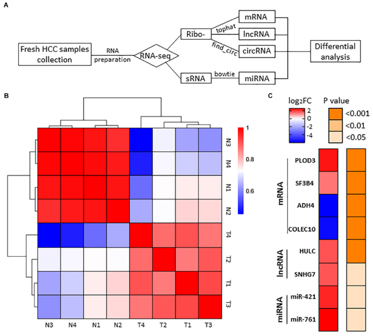 本文主要基于高通量测序技术,分析miRNA,circRNA,lncRNA和mRNA的表达水平,然后进行共表达分析,找出HCC特异性的RNA表达变化状态,基于这些特定RNA分子做通路分析和临床标本验证。