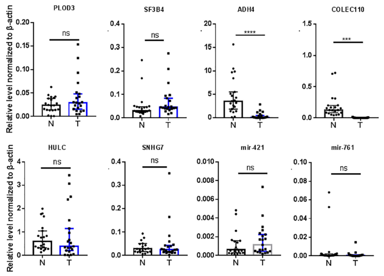 除了本文研究中分析到的分子,作者还汇总了其他文献中报道的分子,并在本文所用的21对HCC与癌旁组织中进行了QPCR验证。在所挑选的8种分子(PLOD3, SF3B4, ADH4, COLEC10, HULC, SNHG7, miR-421, miR-761)中,仅有两种分子有比较一致的变化状态(ADH4 和COLEC10)。