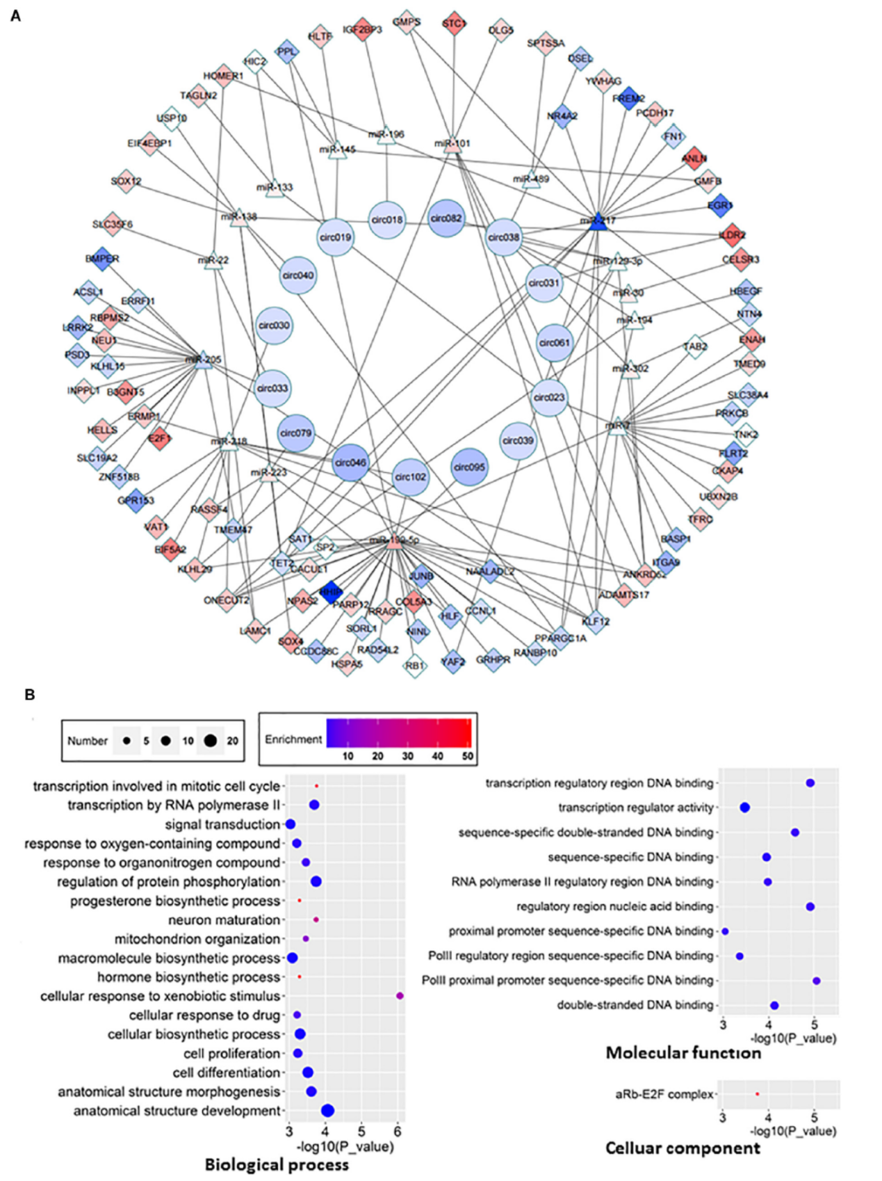circRNA通常通过竞争性结合miRNA发挥作用,作者也进行了ceRNA的网络分析,构建了HCC中circRNA的ceRNA网络,并针对下游基因做了通路分析。