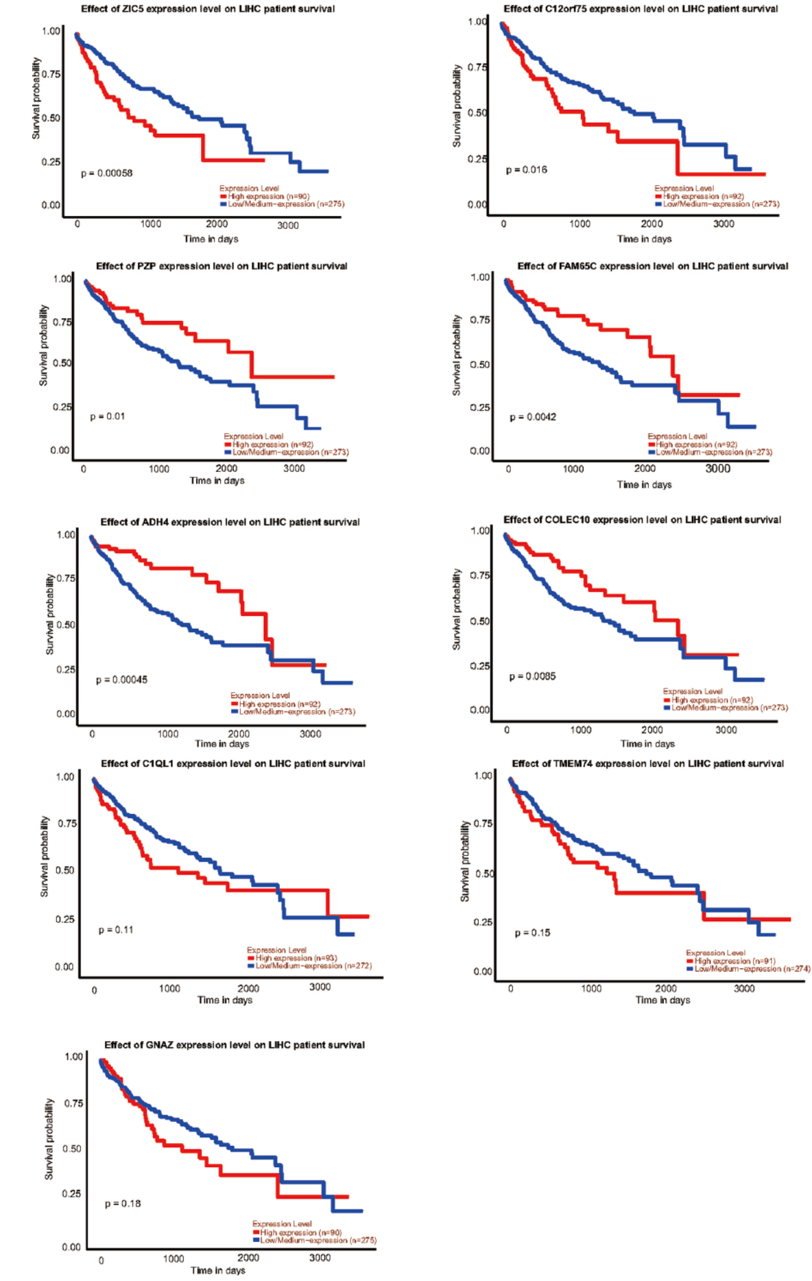 最后,作者通过TCGA数据分析工具UALCAN分析了9种mRNA在HCC病人中的生存曲线状态,其中7种基因的生存曲线表现出典型的相关性。