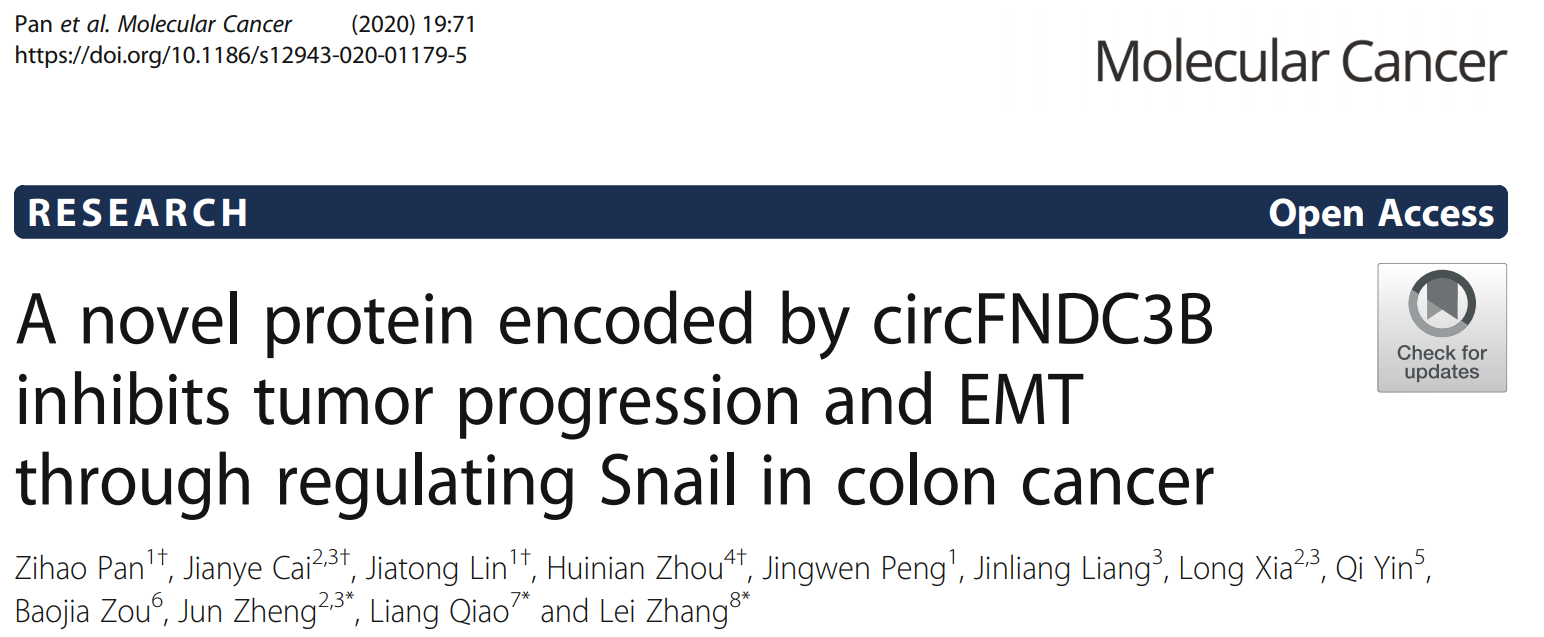 circRNA翻译是非常受关注的研究思路,近几年已经有十余篇研究报道。4月2日,Molecular Cancer杂志发表了一项circRNA翻译蛋白的研究工作,报道结肠癌中circFNDC3B编码蛋白可以抑制Snai1表达并抑制EMT和肿瘤进展。中山大学附属第三医院郑俊和张磊,悉尼大学Storr肝病研究中心乔梁教授为本文的共同通讯作者([1])。