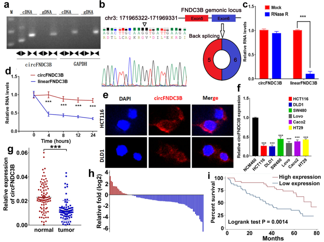 circFNDC3B由FNDC3B基因的5和6外显子形成,作者设计反向引物验证了结肠癌中circFNDC3B的存在,Sanger测序验证了接口位置的序列。RNase R实验,放线菌素D实验,FISH实验分析了circFNDC3B分子的基本情况,结果显示circFNDC3B主要定位在细胞质中。临床标本检测结果表明circFNDC3B在结肠癌中显著低表达,临床标本中,circFNDC3B表达低的患者预后更差。