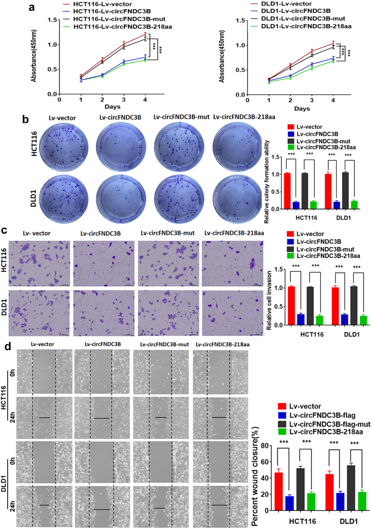 前面的结果中circFNDC3B具有抑制细胞增殖和迁移侵袭的作用,那么是circFNDC3B作为非编码RNA的属性起的作用,还是其编码的蛋白起的作用呢?基于上述设计的突变载体,作者分析了四种载体的功能情况,结果表明circFNDC3B-218aa是发挥功能的关键。