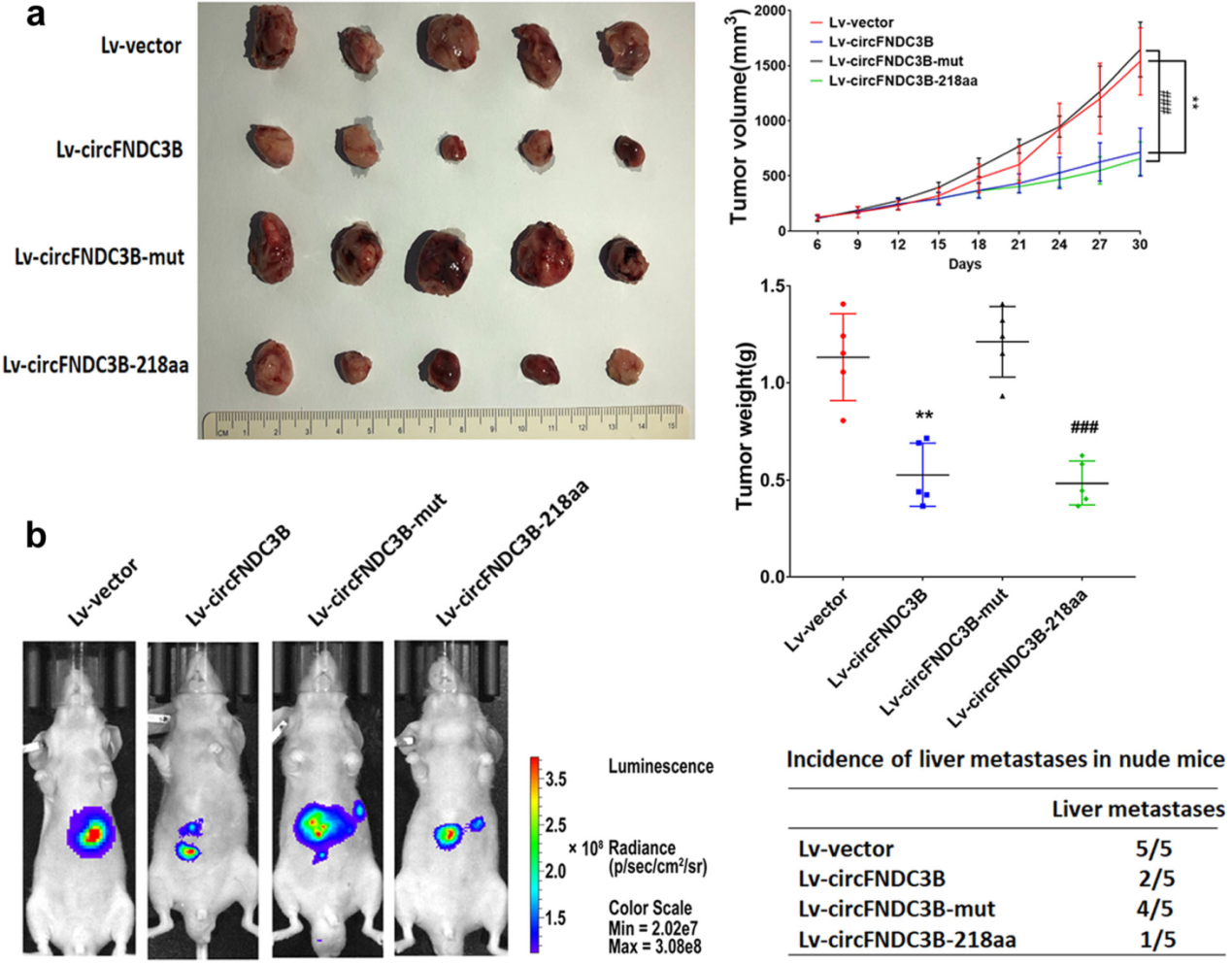 体内实验也证明circFNDC3B-218aa可显著抑制肿瘤生长速度。起始密码子突变后的circFNDC3B影响不明显。