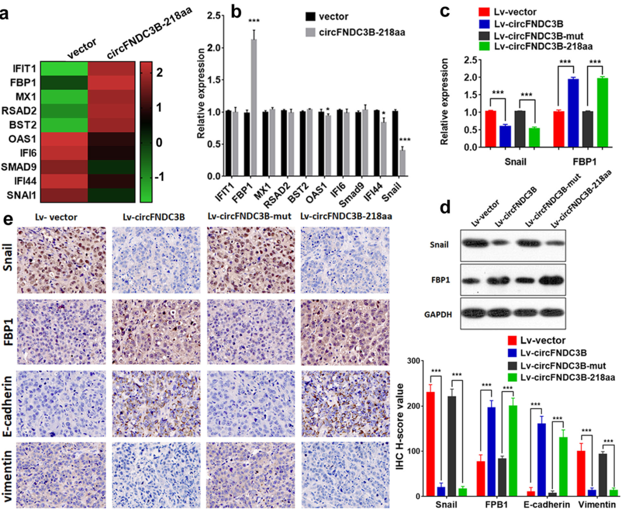 为分析circFNDC3B-218aa的功能机制,作者通过RNA-seq分析了过表达circFNDC3B-218aa前后基因表达差异情况。发现circFNDC3B-218aa可以促进FBP1的表达而抑制Snai1的表达。细胞和动物实验的标本也验证了这些现象。
