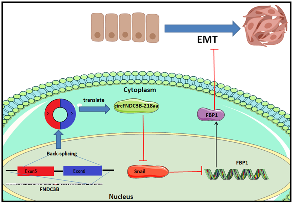 circFNDC3B在结肠癌中通过翻译一个218aa的蛋白,负调控Snai1的表达,进而释放了Snai1对FBP1的抑制效应,FBP1进而抑制EMT,抑制肿瘤进展。