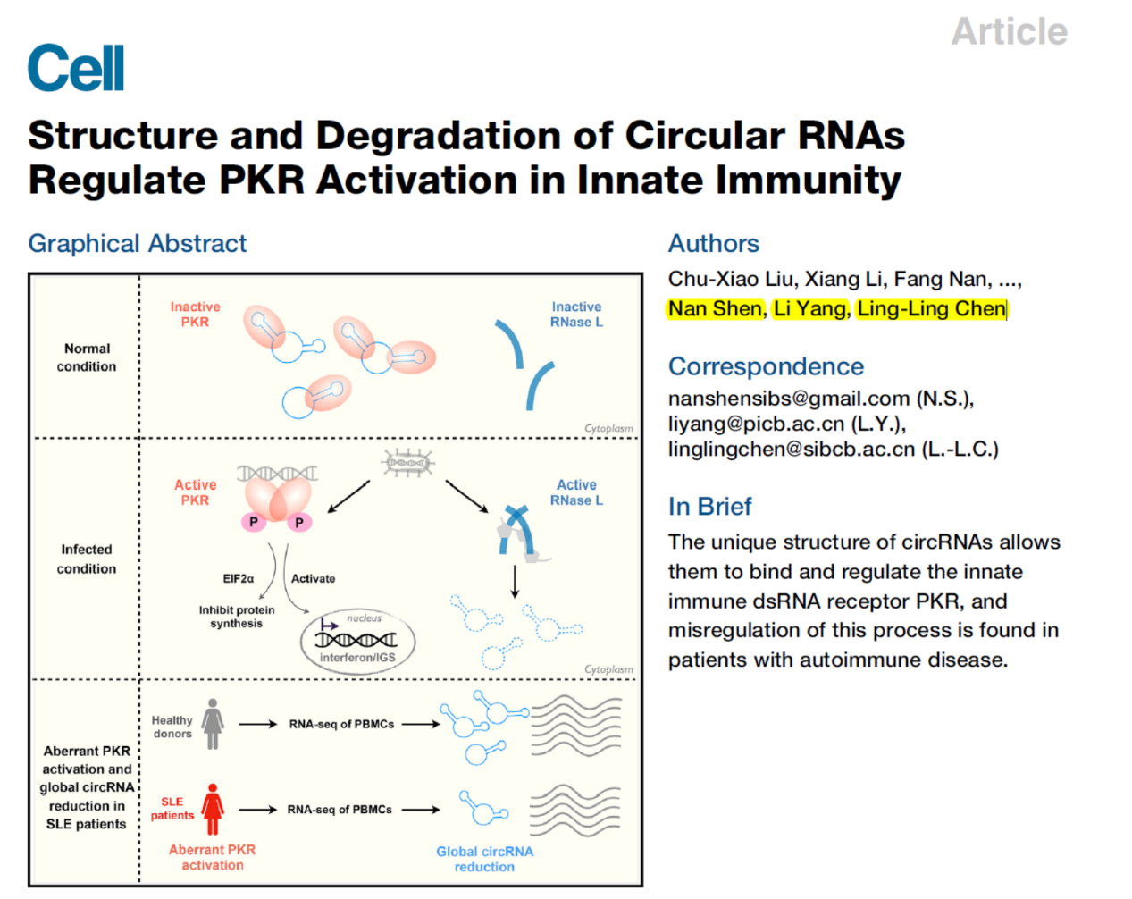 1. Chu-Xiao Liu, X.L., Fang Nan, Shan Jiang, Xiang Gao, Si-Kun Guo, Wei Xue, Yange Cui, Kaige Dong, Huihua Ding, Bo Qu, Zhaocai Zhou, Nan Shen, Li Yang and Ling-Ling Chen, Structure and Degradation of Circular RNAs Regulate PKR Activation in Innate Immunity. Cell, 2019.