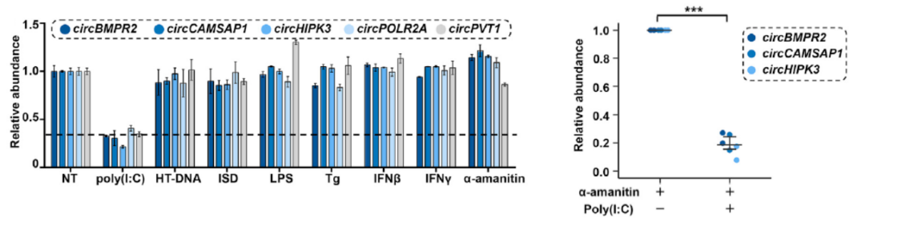 circRNA的降解机制一直未能得到很好的解析,作者早期也是希望能通过不同的刺激条件探索与circRNA降解有关的条件和通路,于是作者分析了不同刺激条件对circRNA丰度的影响情况。作者挑选了五种广泛表达且丰度较高的circRNA分子(见图1),分析了它们在Hela细胞中分别受不同刺激条件后的表达丰度变化情况,选择的刺激条件包括:poly(I:C)刺激(常用与模拟病毒感染刺激),HT-DNA(herring testes DNA,模拟双链DNA刺激),ISD(IFN-stimulating DNA,模拟双链DNA刺激),LPS(细菌脂多糖,模拟细菌感染),Tg(thapsigargin,模拟细菌感染),IFNγ(炎症性细胞因子),α-amanitin(RNA聚合酶II抑制剂,抑制转录)。其中poly(I:C)刺激可显著降低circRNA的丰度,其他条件均变化不明显。α-amanitin是RNA聚合酶II的抑制剂,在该实验的条件下没有显著降低几个被挑选的circRNA的丰度,但叠加处理poly(I:C)则可显著降低这些circRNA的丰度,说明poly(I:C)处理是促进circRNA的降解的。poly(I:C)处理促进circRNA降解的现象也在其他细胞中得到了验证,包括PA1, THP1和 Jurkat细胞。