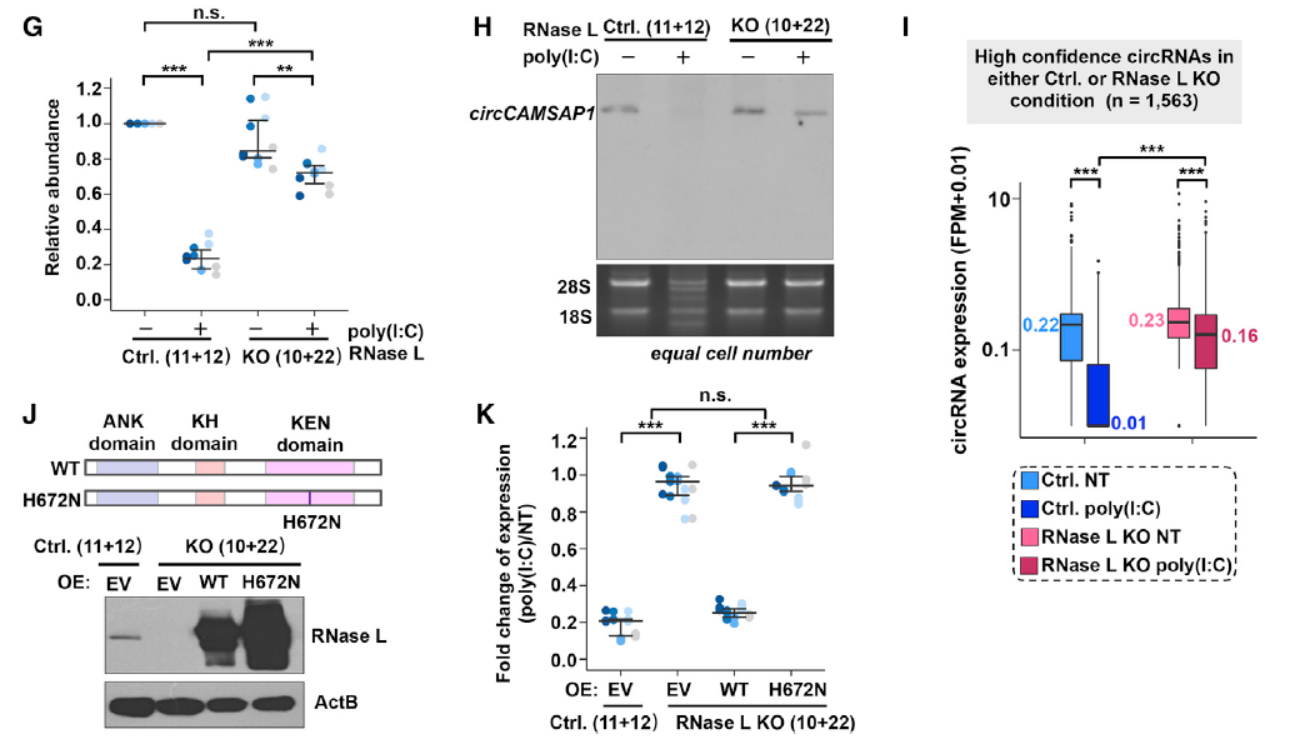 已知病毒感染或poly(I:C)处理后能激活RNase L(一种广泛存在的RNA内切酶,二聚化后可降解RNA),为分析是否是RNase L介道了poly(I:C)处理后的circRNA降解过程,作者在Hela细胞中构建了RNase L敲除细胞系,结果表明敲除RNase L后poly(I:C)处理不能显著促进circRNA的降解,巧除细胞株中回补野生型或突变型RNase L也验证了对应的现象。作者也构建了RNase L干扰的模型,也能佐证了相关的现象。poly(I:C)处理或EMCV感染后RNase L不仅能降解circRNA,也能降解线性的mRNA,但mRNA的降解比例不高,仅有10-30%,circRNA的降解比例则高达80-90%。