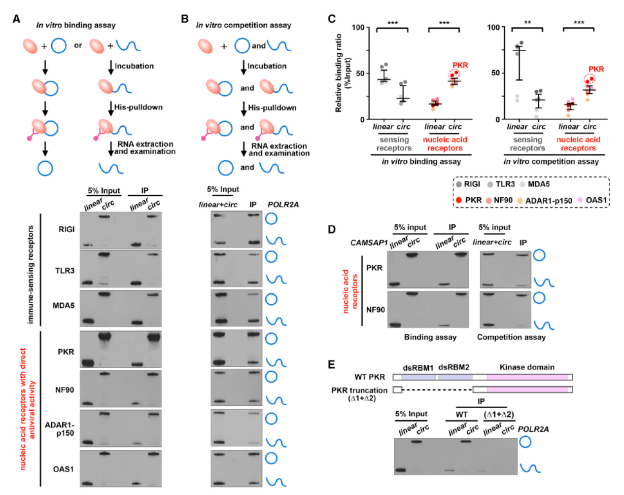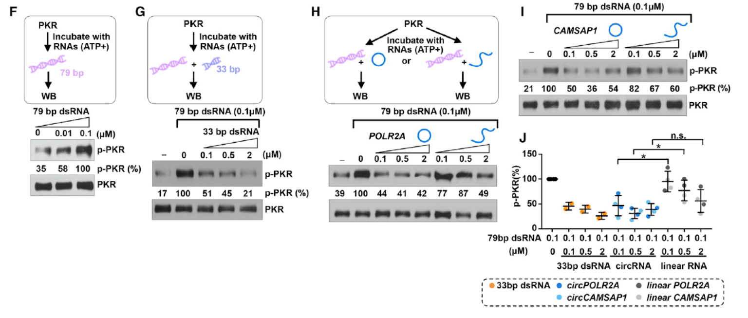 已知PKR在结合33bp以上的dsRNA后可自磷酸化和激活,当长度达到79bp时活性最高。但小于33bp的(16-33bp范围)的dsRNA则抑制PKR的活性。表达纯化的PKR在体外可被33bp以上的dsRNA激活自磷酸化,但16-33bp的不能激活。circPOLR2A和circCAMSAP1不能激活PKR但对应的线性分子可以激活PKR。这些体外实验说明PKR具有选择性结合circRNA的特点,结合了circRNA后自身活性受到抑制。