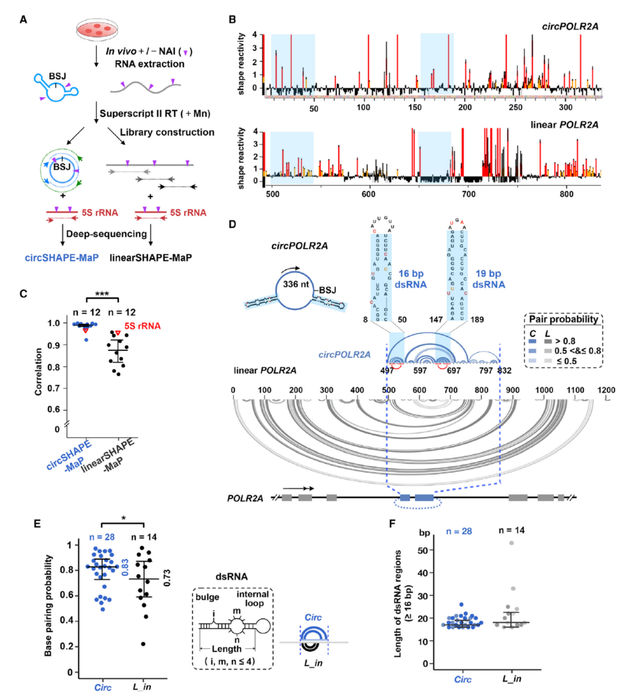 RNA分子内部的二级结构也具有双链RNA的特点,会不会是circRNA分子内部的二级颈环结构介道了与PKR的结合并抑制了它的活性?作者通过SHAPE-MaP测序分析了34种circRNA和对应序列的线性RNA分子中二级结构的情况,其中有12种circRNA得到了对应的线性RNA结果,这些分子的分析结果表明circRNA中二级结构与对应的线性RNA有所不同。circRNA中小颈环结构更多。